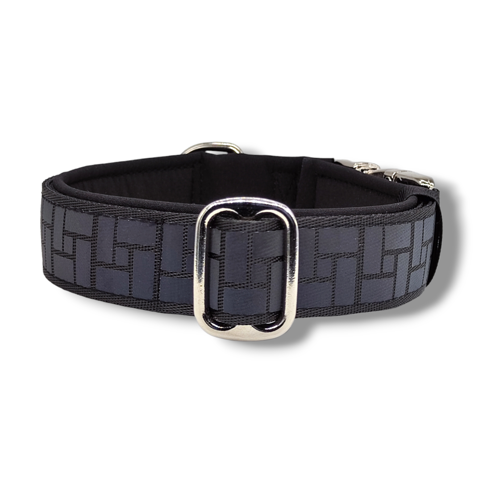 Auf dem robusten, schwarzen Gurtband aus Polypropylen ist ein schwarzes, reflektierendes Band aufgenĂ€ht. Bei Tageslicht sieht das Band schlicht und edel aus. In der Dunkelheit zeigt es sich bei Lichteinfall in allen Regenbogenfarben. Die Polsterung aus schwarzem Softshell ist sehr weich, wasserabweisend und angenehm am Hals. Der silberne Klickverschluss hat abgerundete Kanten und eine leichte Biegung und sorgt so fĂŒr ein angenehmes TragegefĂŒhl bei deinem Hund.